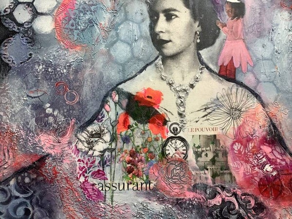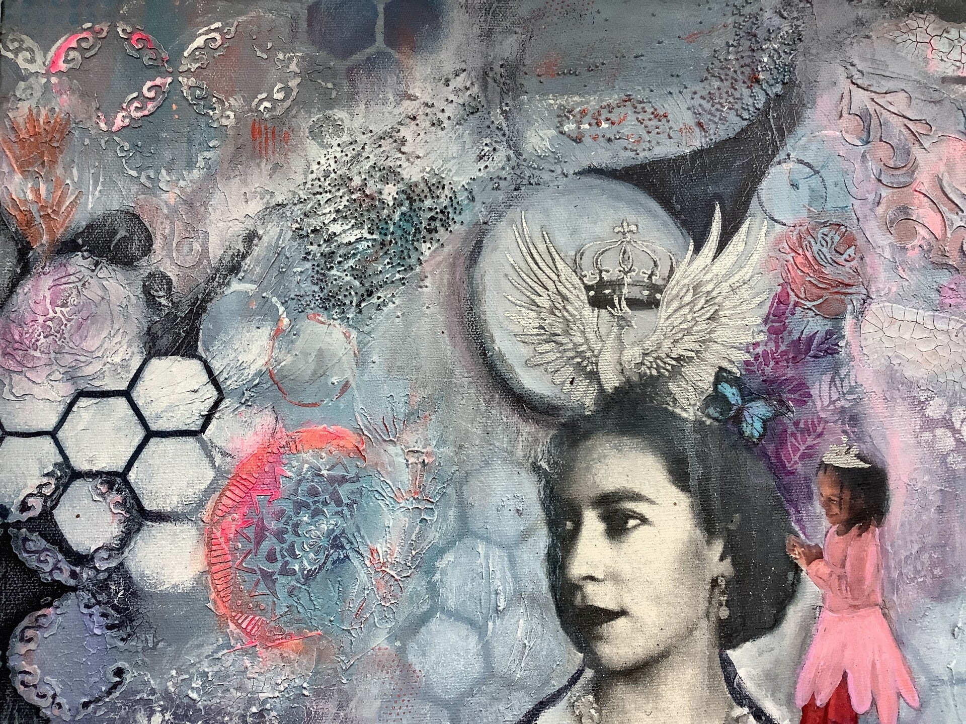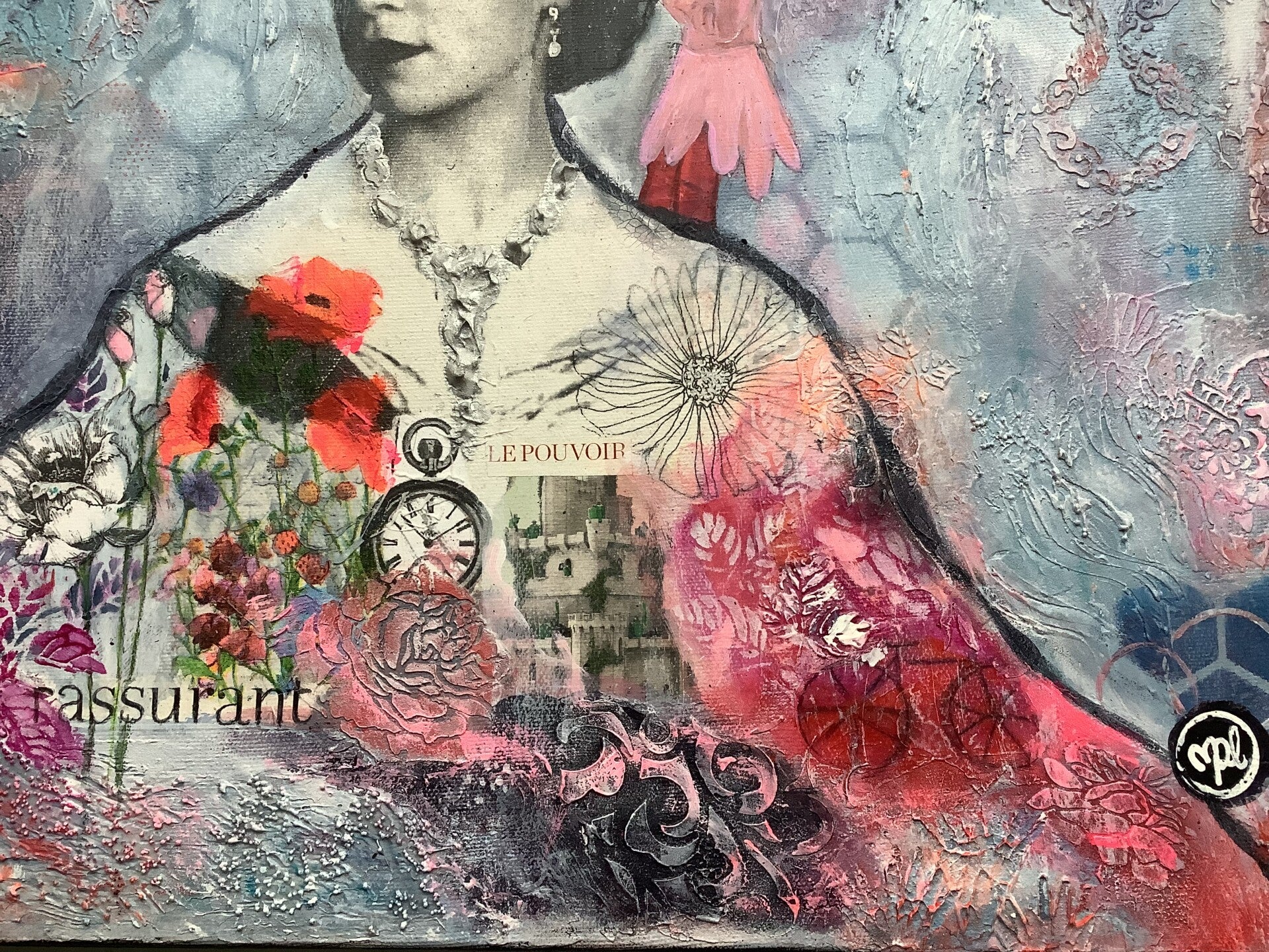 technique mixte : transfert image , acrylique, pastel , aquarelle , mortier de structure léger